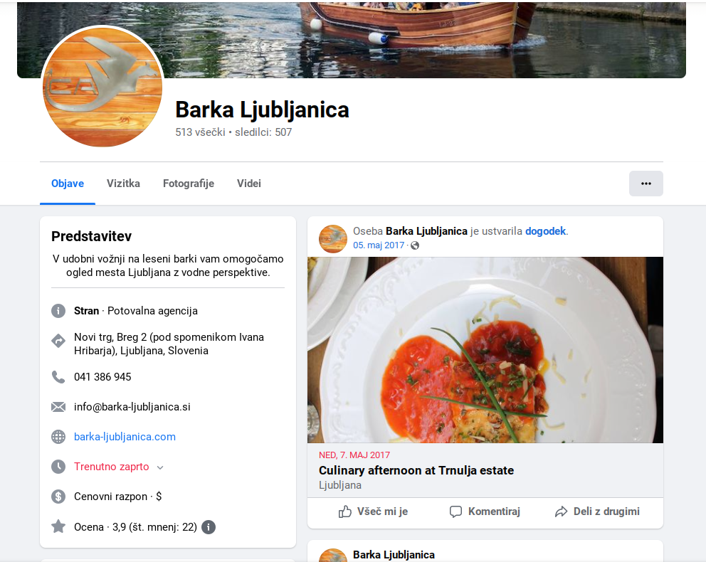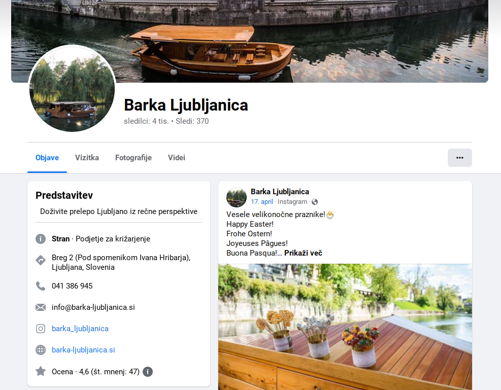 V letu 2024 bomo zopet prisotni tudi na družabnih omrežjih, kot je recimo Facebook. Predstavili bomo novo Facebook stran naše posodobljene lesene lepotice barke Ljubljanice z željo, da bi se s tem še bolj povezali z vami, našimi domačimi gosti in plovb po Ljubljanici željnimi tujimi obiskovalci! Trenutno uradno na Facebooku, kot tudi na drugih družabnih omrežjih, (še) nismo prisotni, čeprav so strani iz preteklosti, s katerimi nismo več povezani, še vedno dosegljive.